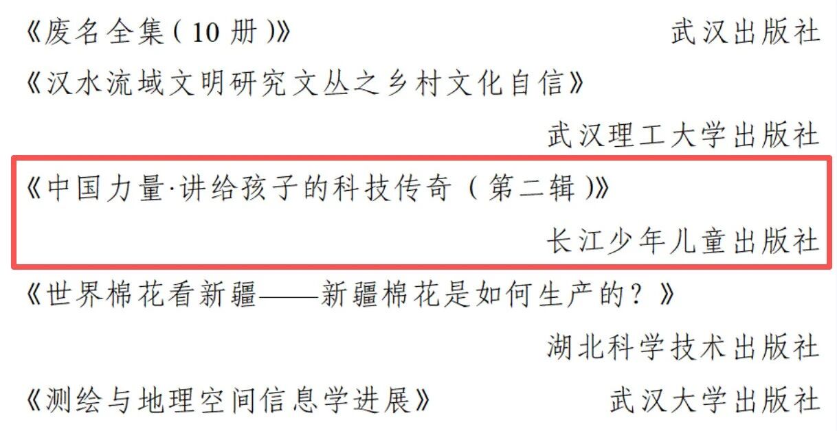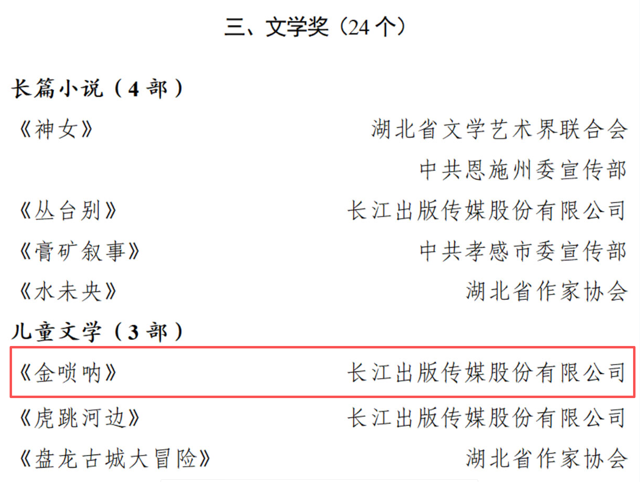 12月,湖北省屈原文化奖完成评选公示。长江少年儿童出版社出版的《金唢呐》获评“屈原文化奖文学奖”,《中国力量·讲给孩子的科技传奇(第二辑)》《中国共产党人精神谱系故事绘本(30册)》获评“屈原文化奖出版奖”。