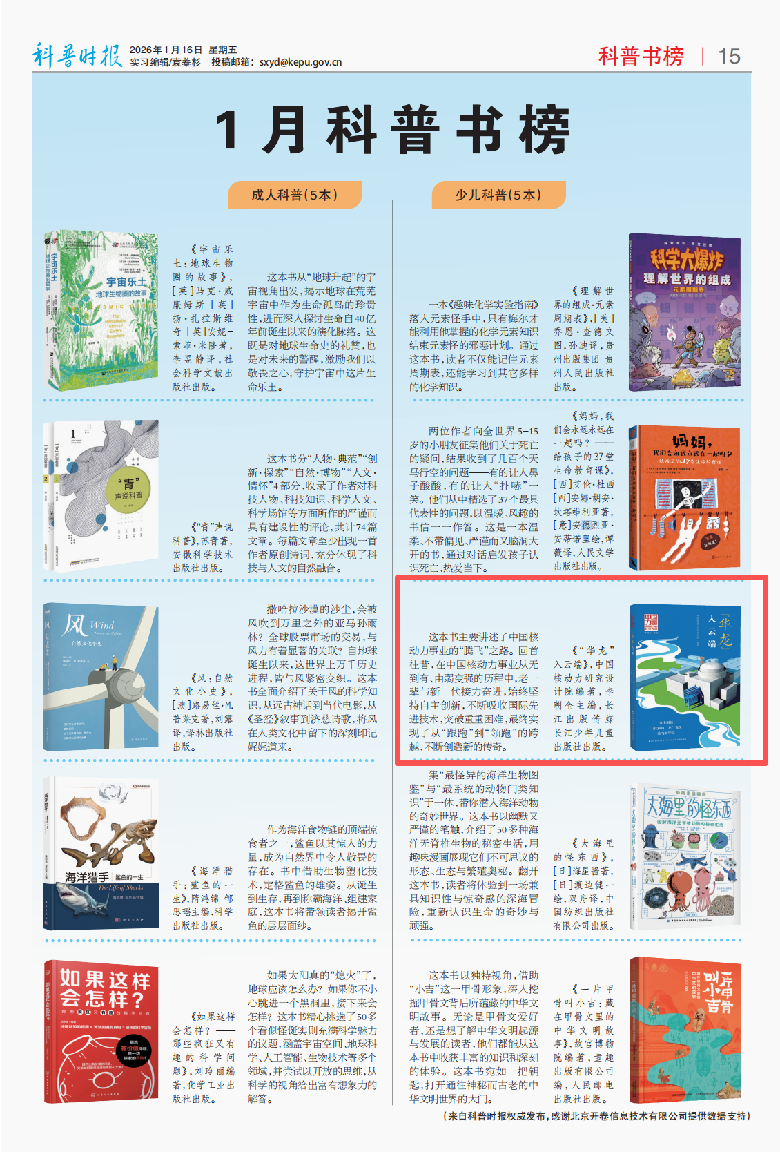 近日,长江少年儿童出版社出版的《中国力量·讲给孩子的科技传奇·“华龙”入云端》入选《科普时报》1月科普书榜。