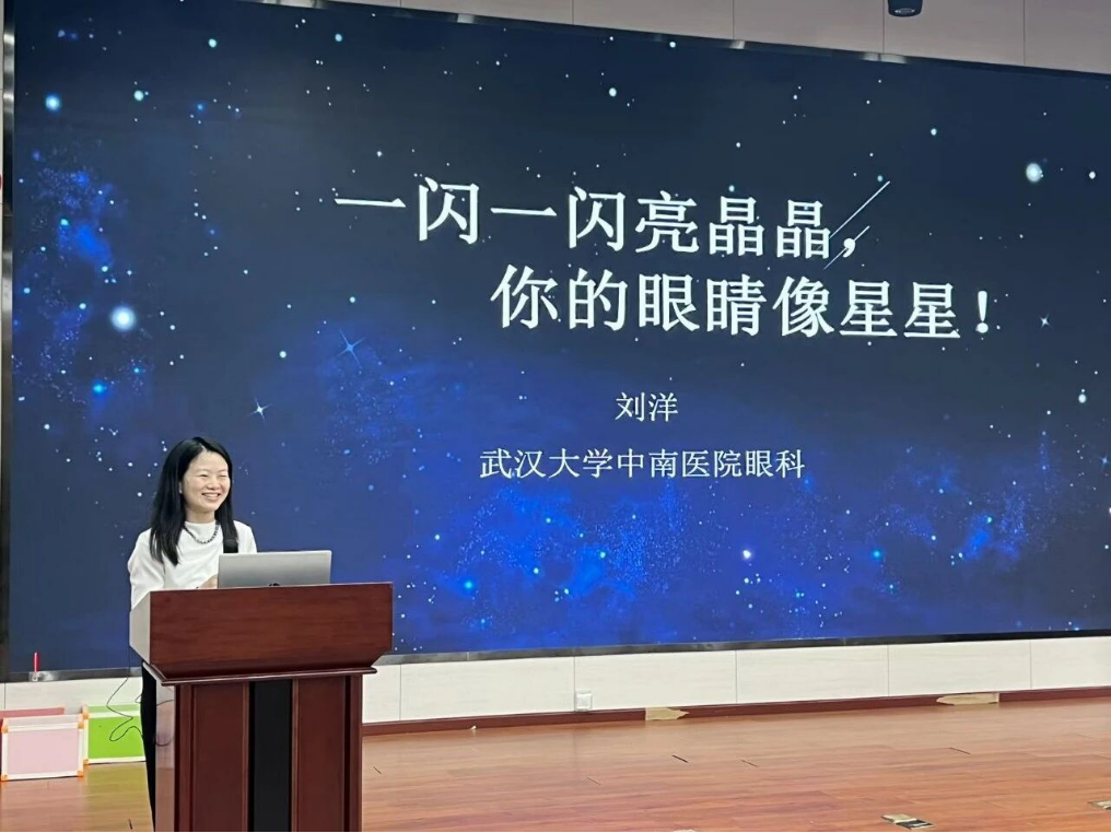 捐赠仪式后,趣味科普课正式开讲。刘洋老师带领孩子们以耳熟能详的童谣“一闪一闪亮晶晶”为切入点,用生动形象的语言揭开“眼睛”这一“人体精密相机”的奥秘。通过3D动画演示眼球的构造,将角膜比作“透明窗户”、视网膜比作“成像屏幕”,把抽象的“光的折射”原理转化为“放大镜聚光”的生活场景,让原本晦涩的生理知识变得直观易懂。孩子们也在这生动有趣的课堂中深刻体会到视力健康的重要性。