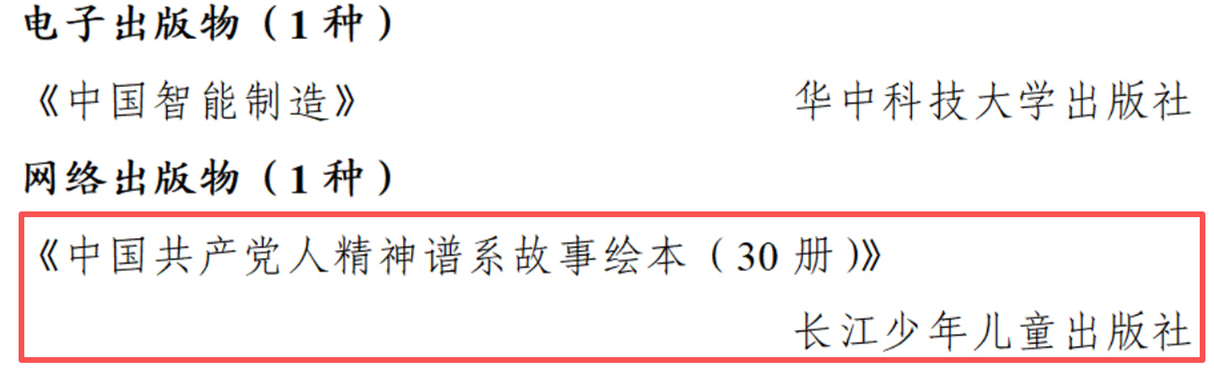 12月,湖北省屈原文化奖完成评选公示。长江少年儿童出版社出版的《金唢呐》获评“屈原文化奖文学奖”,《中国力量·讲给孩子的科技传奇(第二辑)》《中国共产党人精神谱系故事绘本(30册)》获评“屈原文化奖出版奖”。