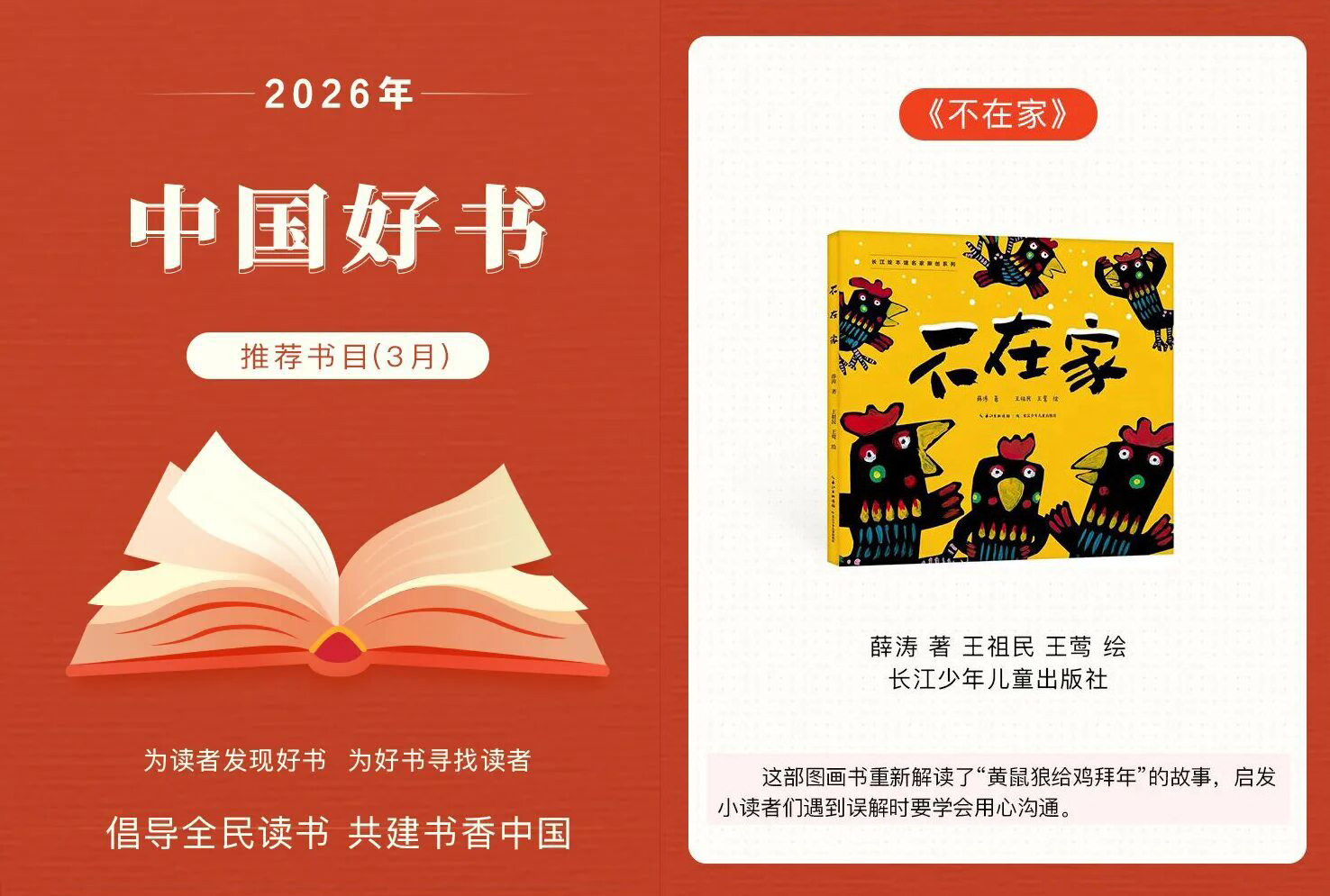 2026年4月13日,中国图书评论学会2026年3月“中国好书”推荐书目发布,长江少年儿童出版社出版的《不在家》(薛涛著;王祖民、王莺绘)入选。